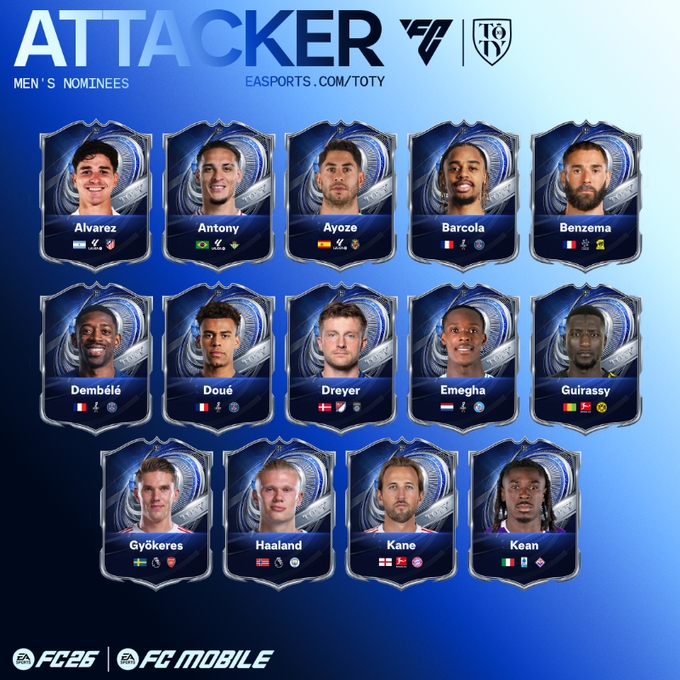 01月08日讯 EA FC26官方公布了年度最佳阵容(年度蓝)的候选名单,其中萨拉赫、亚马尔和拉菲尼亚作为中场入选,在贝蒂斯表现出色的安东尼入选了前锋候选名单,梅西、C罗也入选前锋候选名单。用户可分别选取1名门将、4名后卫、3名中场和3名前锋进行投票。【年度蓝前锋候选】(以图片中位置排名)阿尔瓦雷斯、安东尼、阿约塞·佩雷斯、巴尔科拉、本泽马、登贝莱、杜埃、安...